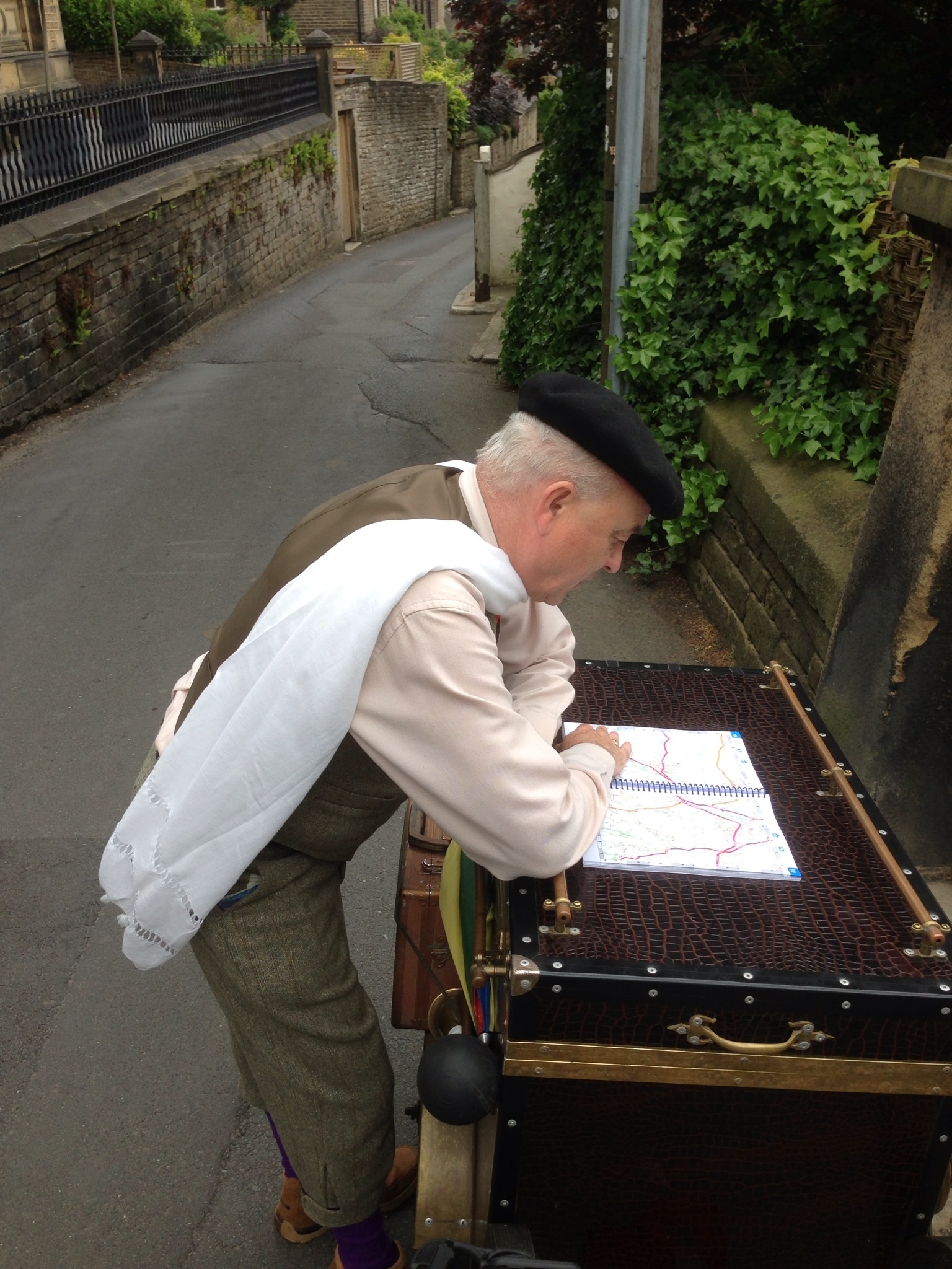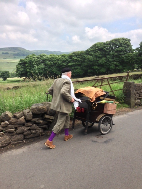 After our photo call we pushed our Dolly up the sharp rise that leads to the foot of Upperthong Lane. Here we were introduced to the lovely people who are very kindly hosting us for the duration of the festival. Lesley and Steve Sykes are friends of the Holmfirth Festival and have a beautiful house with sweeping views of the valley. We enjoyed coffee with them in their garden before unloading our personals and looking up the mount towards Upperthong itself.
